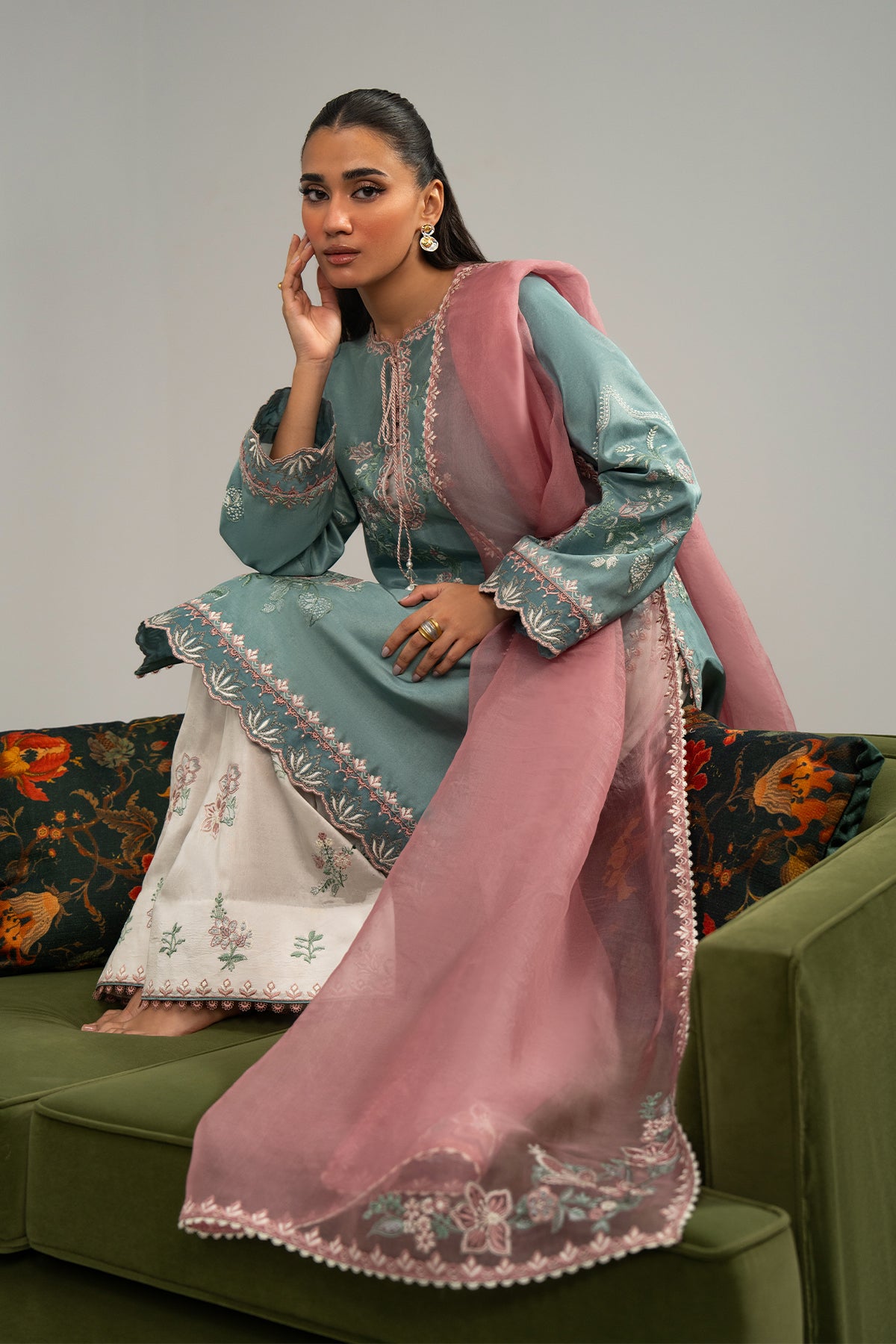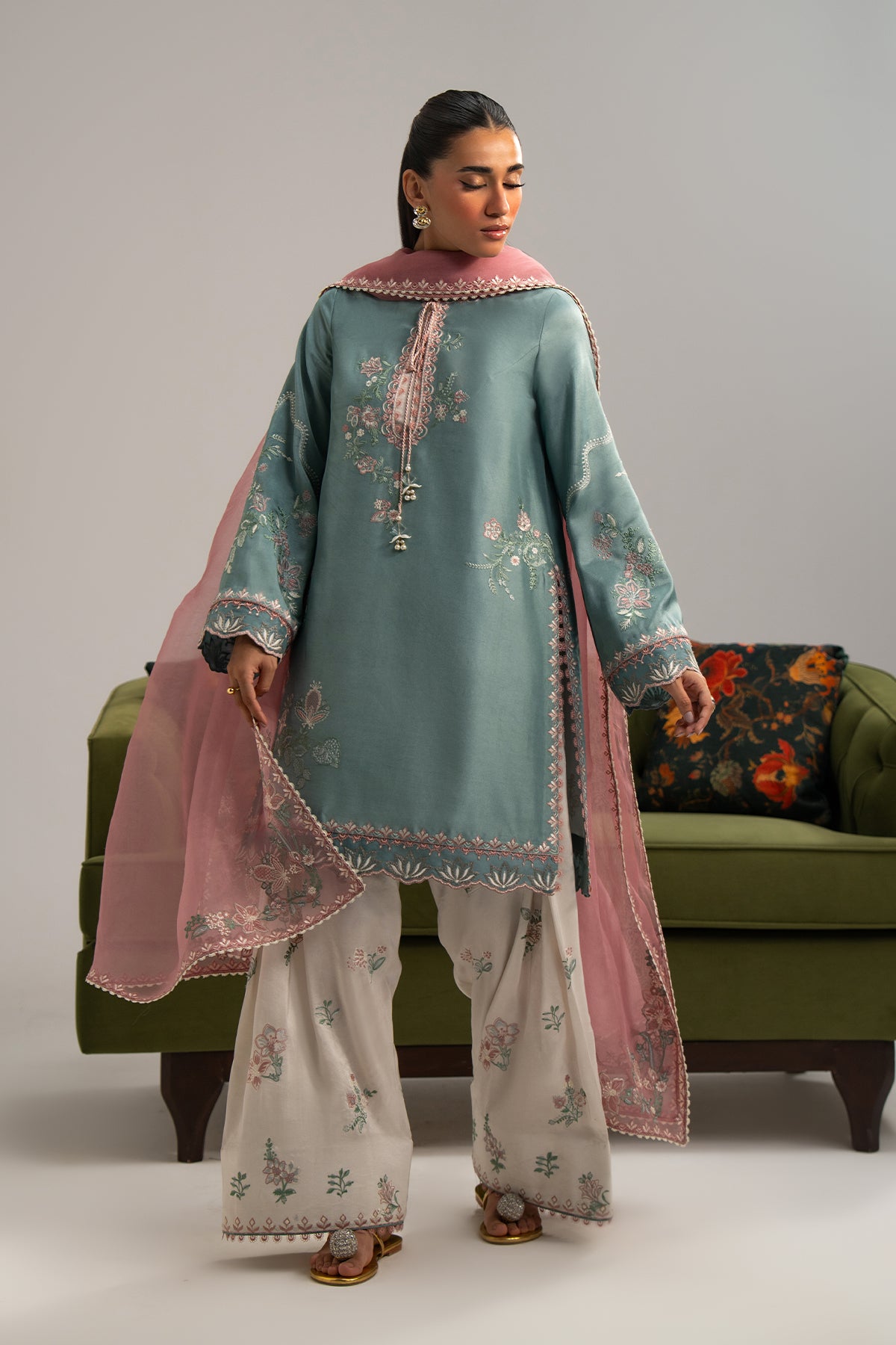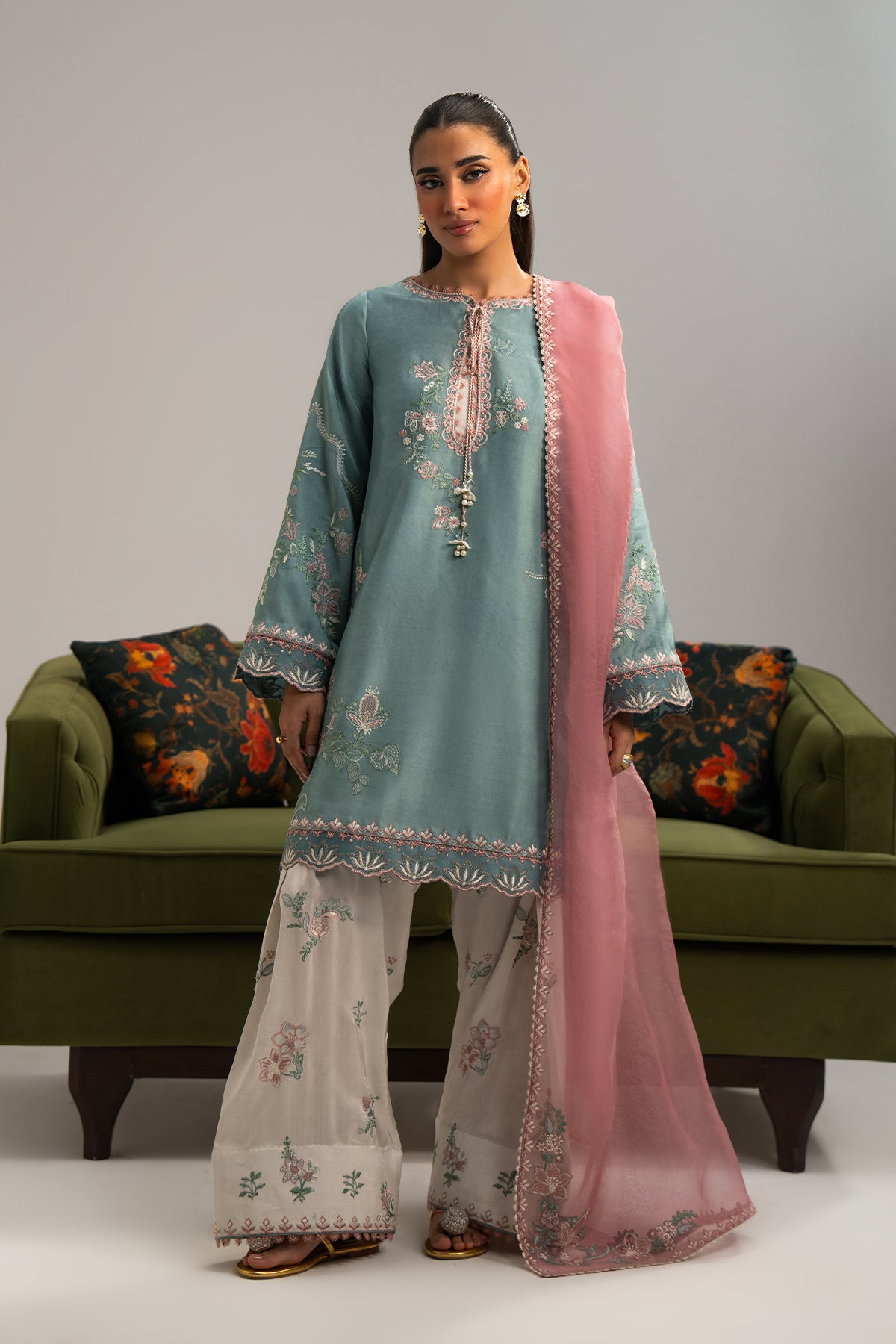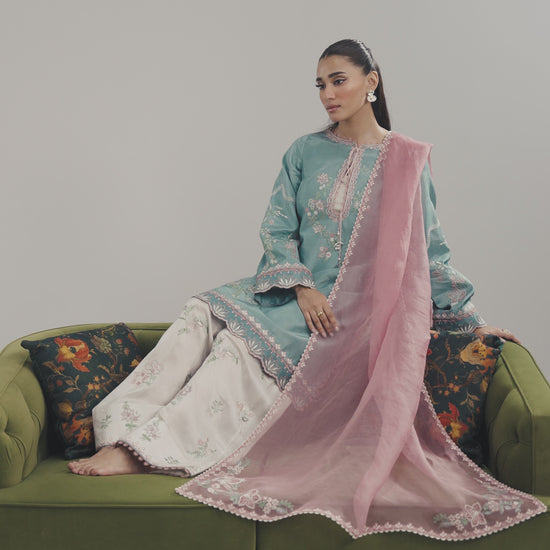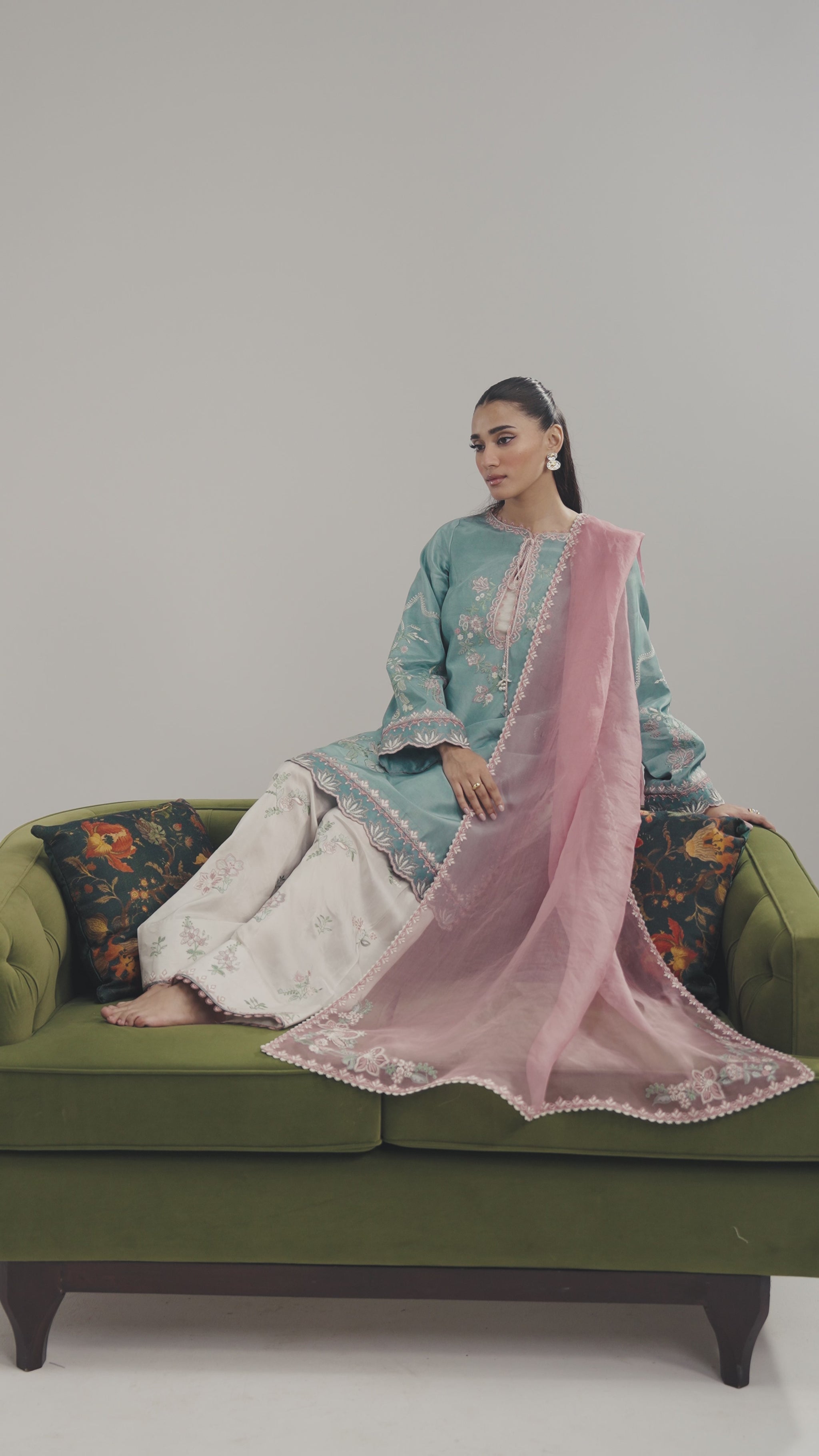 Introducing Lustra — a radiant expression of effortless elegance from our Luxe Line Pret collection. Crafted in pure silk, this ensemble features a chic short kameez paired with a flowing silk shalwar, creating a silhouette that blends tradition with modern ease. An airy organza dupatta completes the look, adding a graceful touch of lightness and charm.