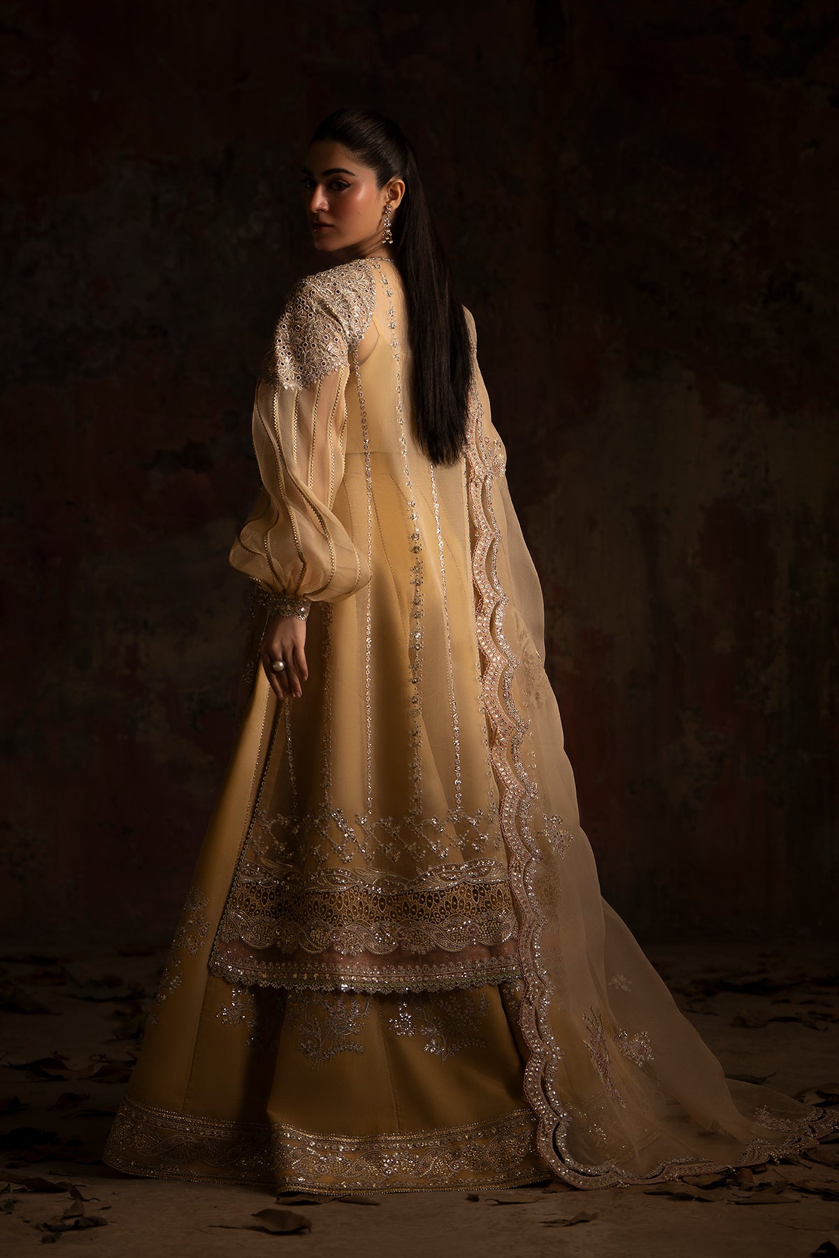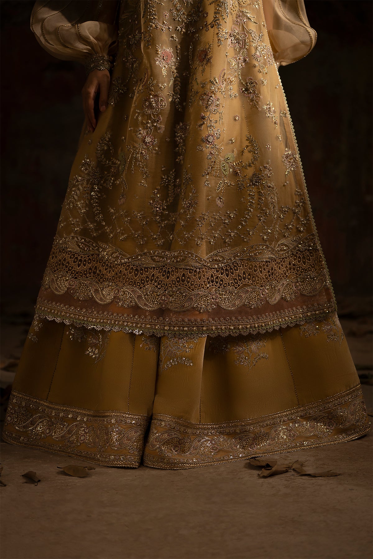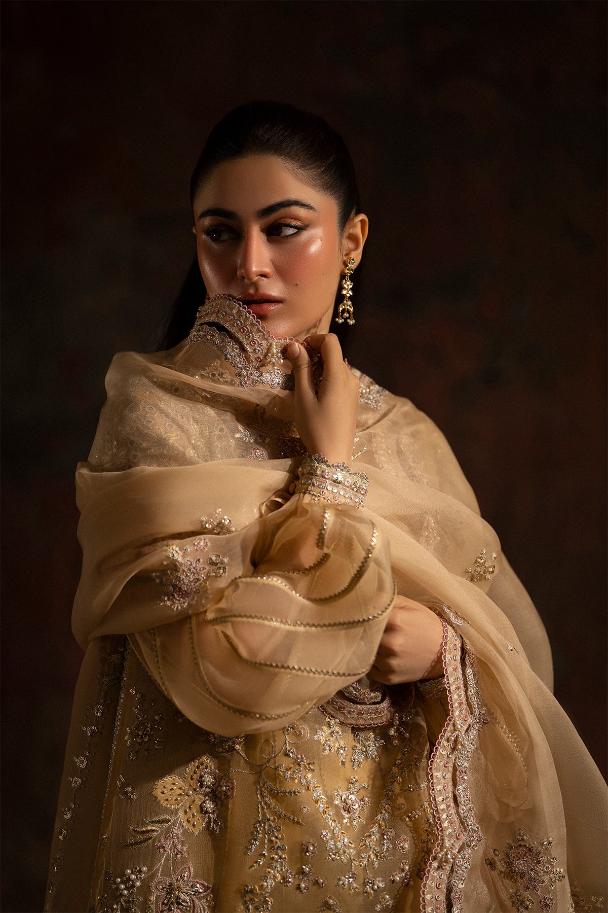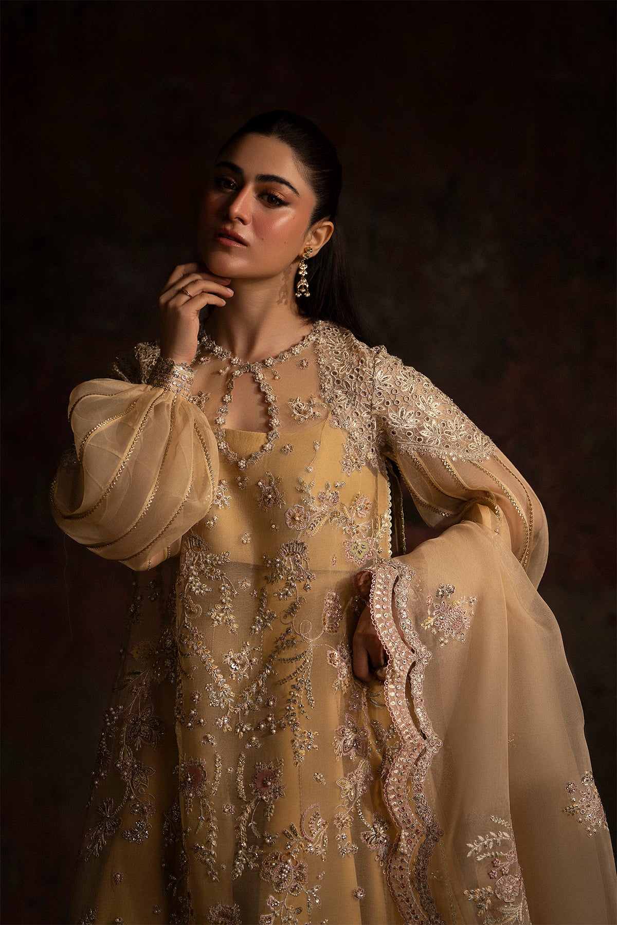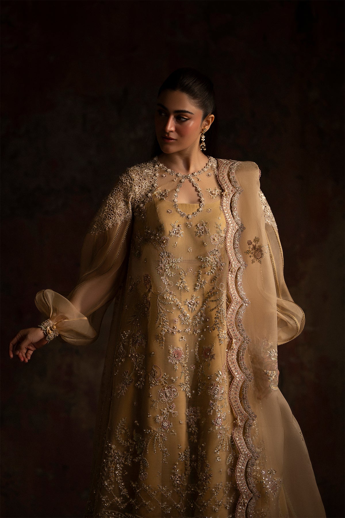 Sunehri is a luminous organza ensemble designed to embody timeless elegance and festive luxury. The shirt features intricate embroidery and delicate embellishments on the front, complemented by a fully embroidered back for a graceful finish. An embroidered organza dupatta adds an ethereal layer, enriched with fine craftsmanship and elegant detailing.