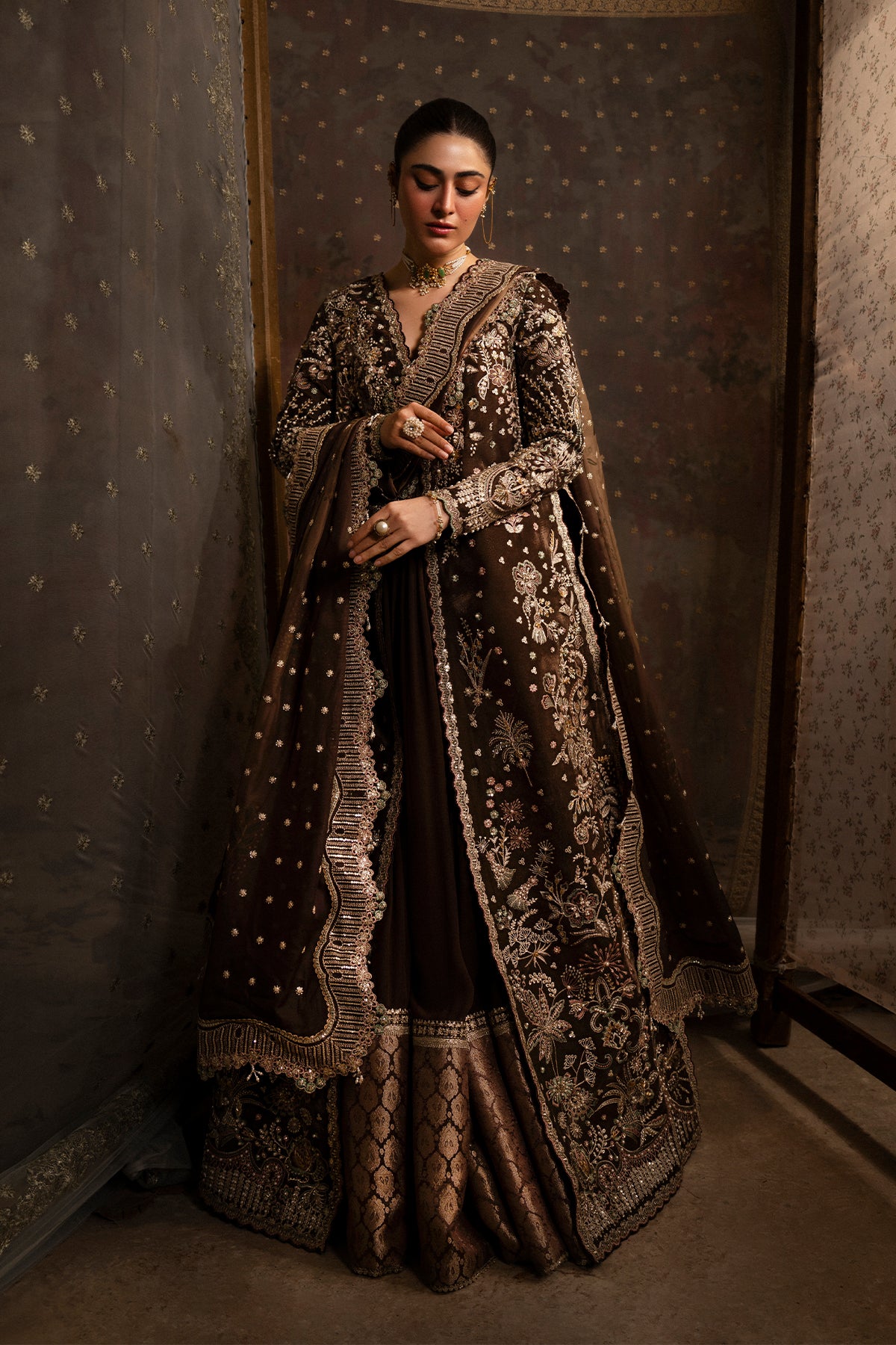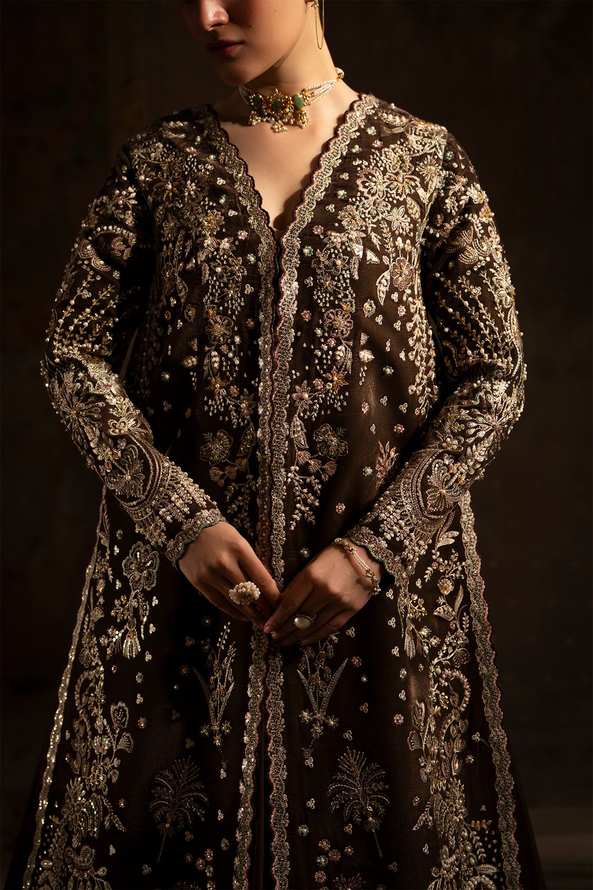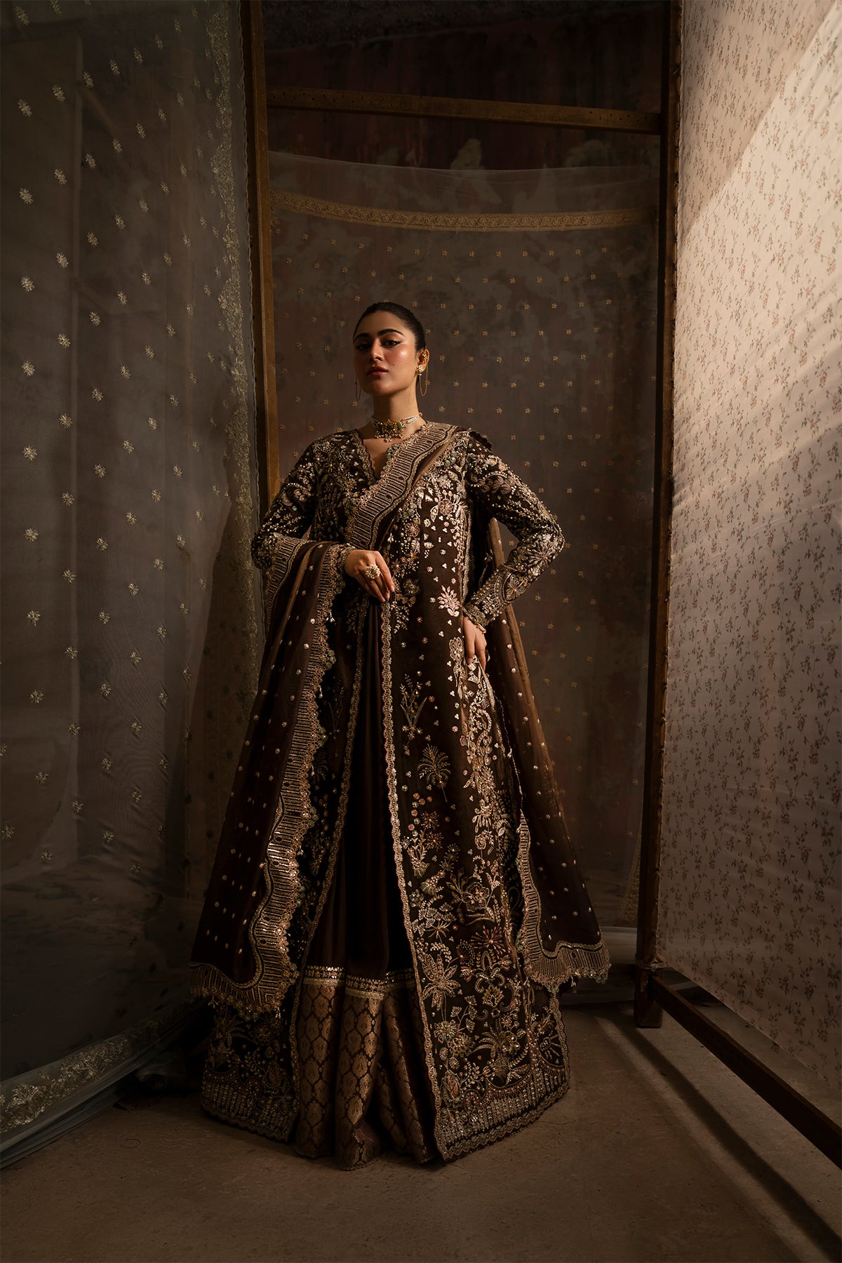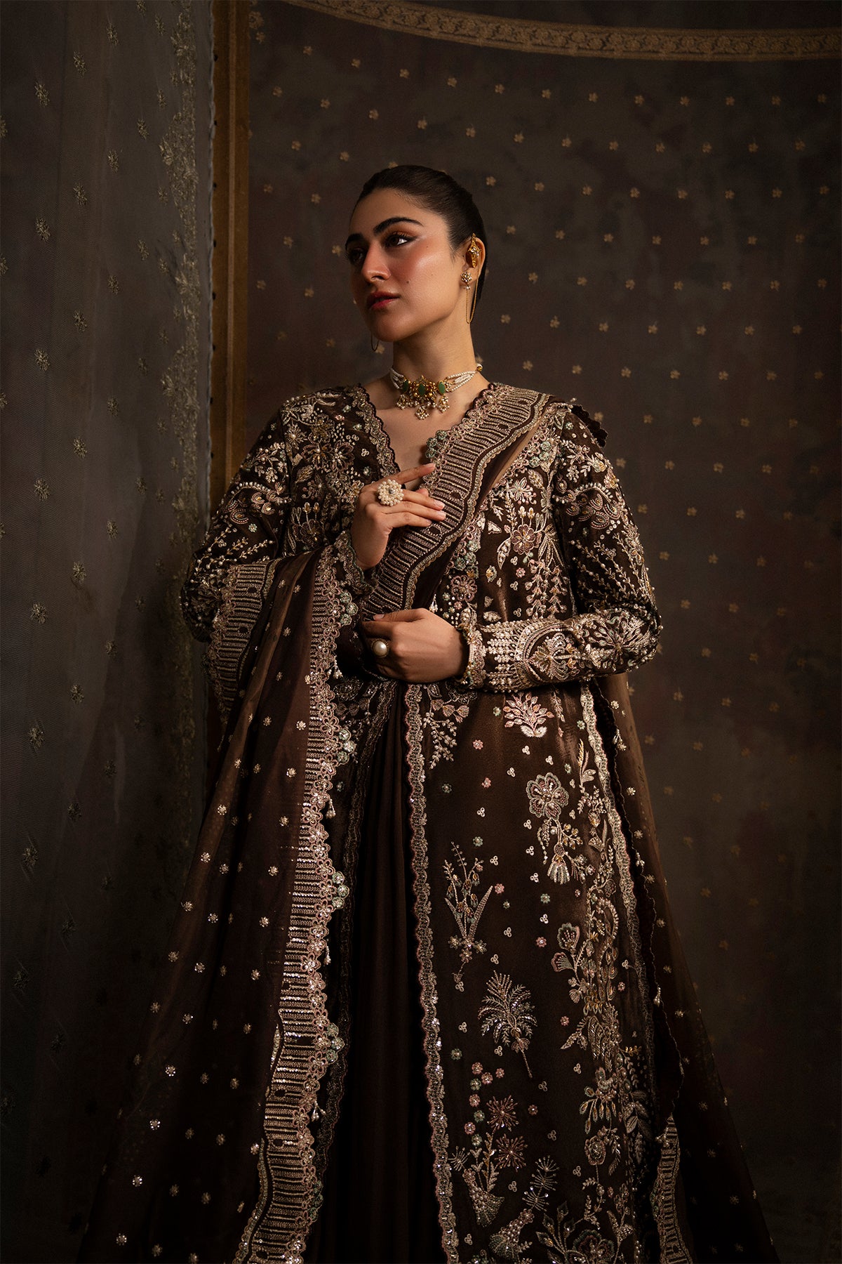 Zareen is a regal velvet ensemble designed to reflect timeless luxury and festive opulence. The velvet shirt is intricately embroidered and delicately embellished with refined thread work, tilla, sequins, pearls, sitara, net flowers, and elegant 3D floral accents, creating a rich and graceful statement. Paired with an embroidered silk dupatta, the ensemble flows beautifully, adding depth and sophistication to the silhouette.